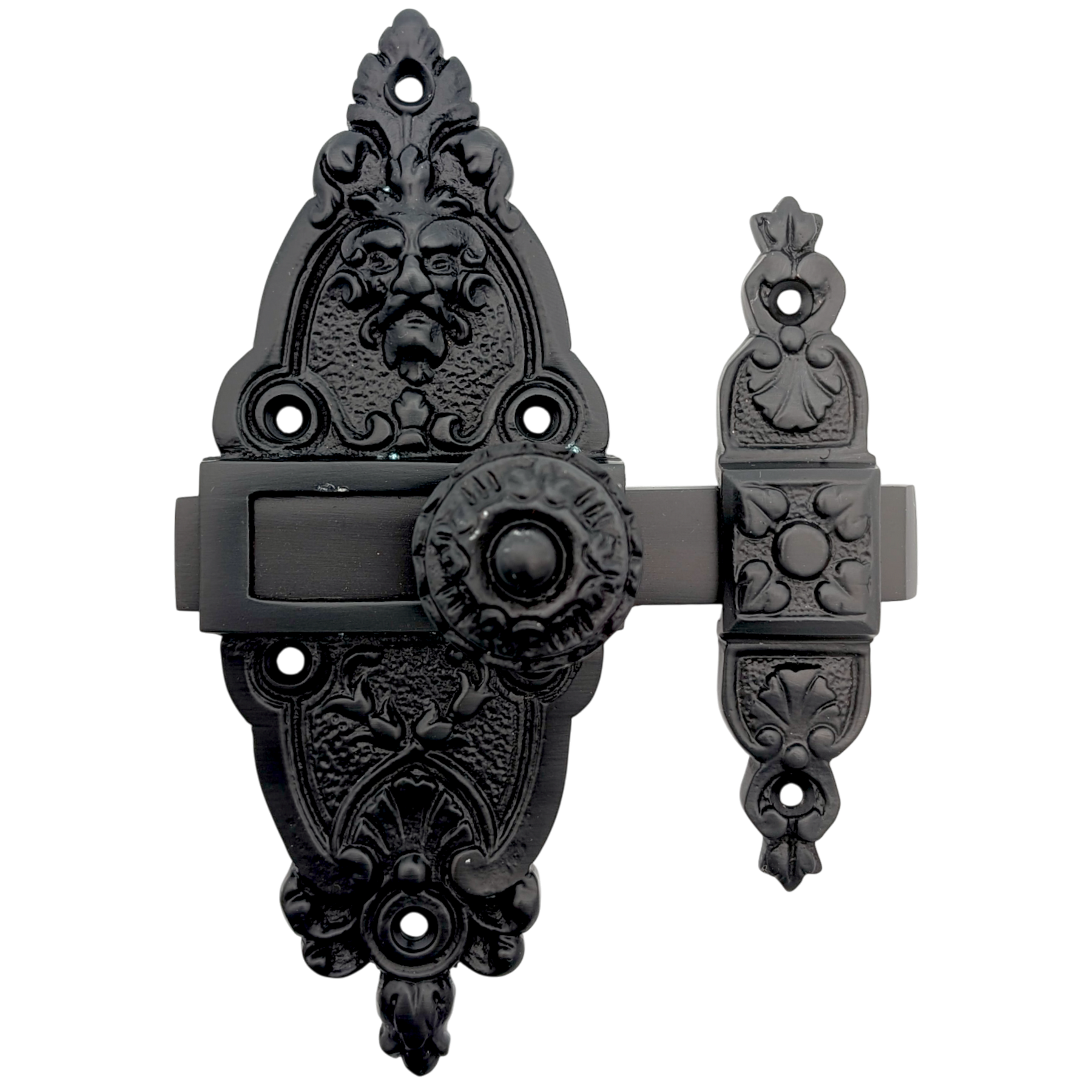 Comes complete with two pieces and mounting screws. Long piece measures 2 inch long and 5 1/2 inch tall (does not include slide bolt measurement) with a projection of 1 1/2 inch. Smaller piece measures 3/4 inch wide and 3 1/2 inch tall. Can be mounted with catch on left or right.