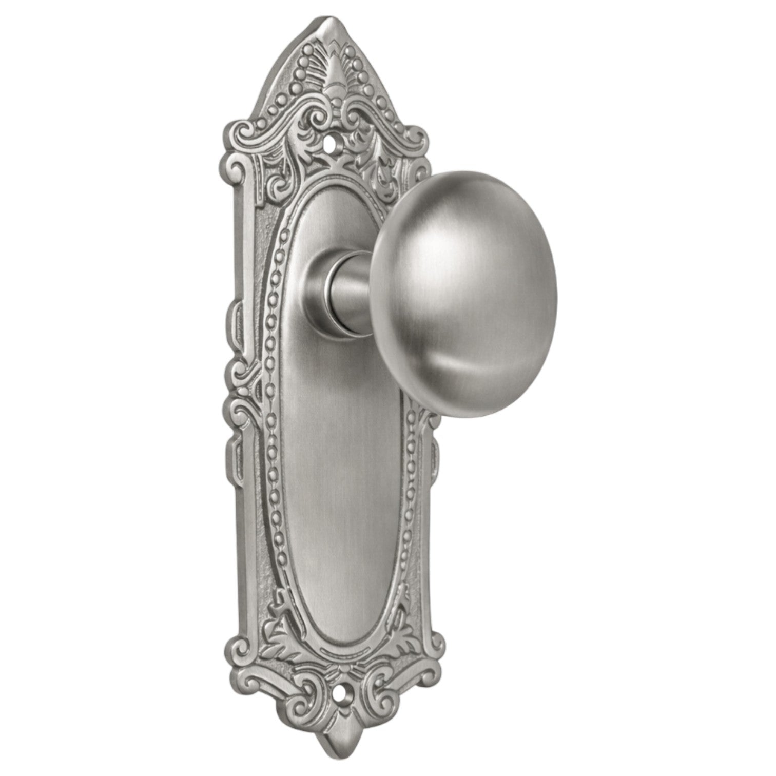 This door set pairs classic egg-style door knobs with an ornate Victorian-style long backplate, reflecting the decorative richness of late 19th-century design.