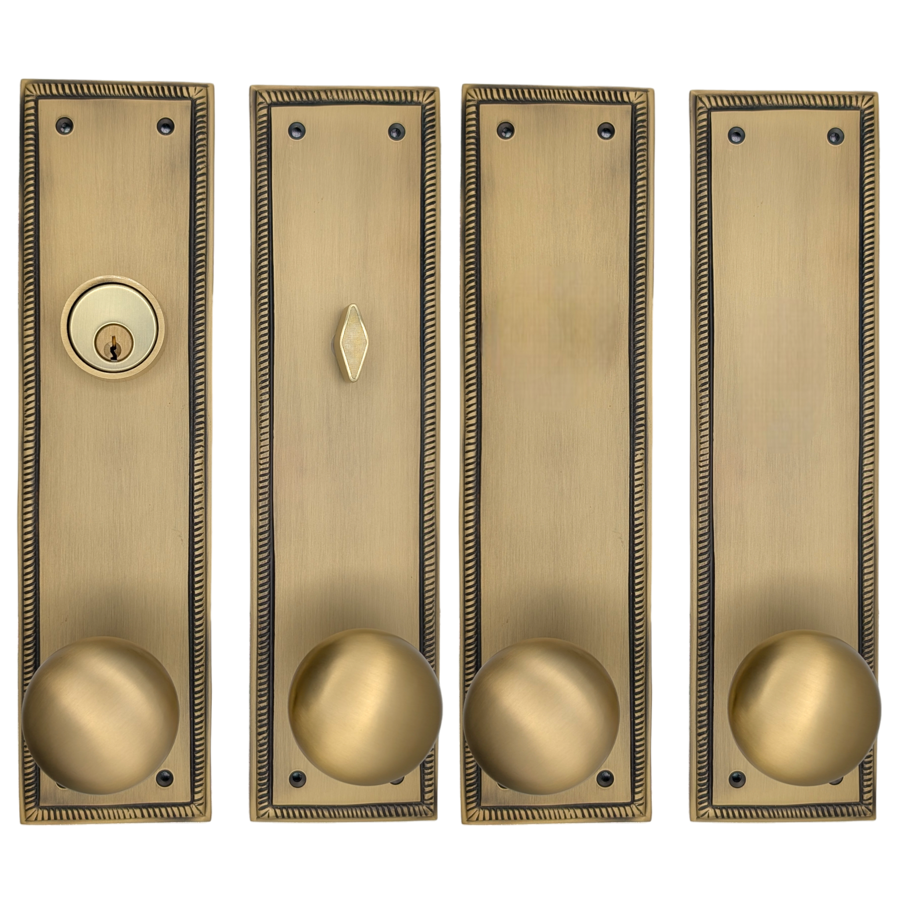 This solid brass double-door entryway set measures 3 inches wide by 11 1/2 inches tall. Choose the brass knob style that best complements your home. The standard center-to-center distance from the deadbolt to the knob is 5 1/2 inches, with other spacing options available upon request as a custom order.