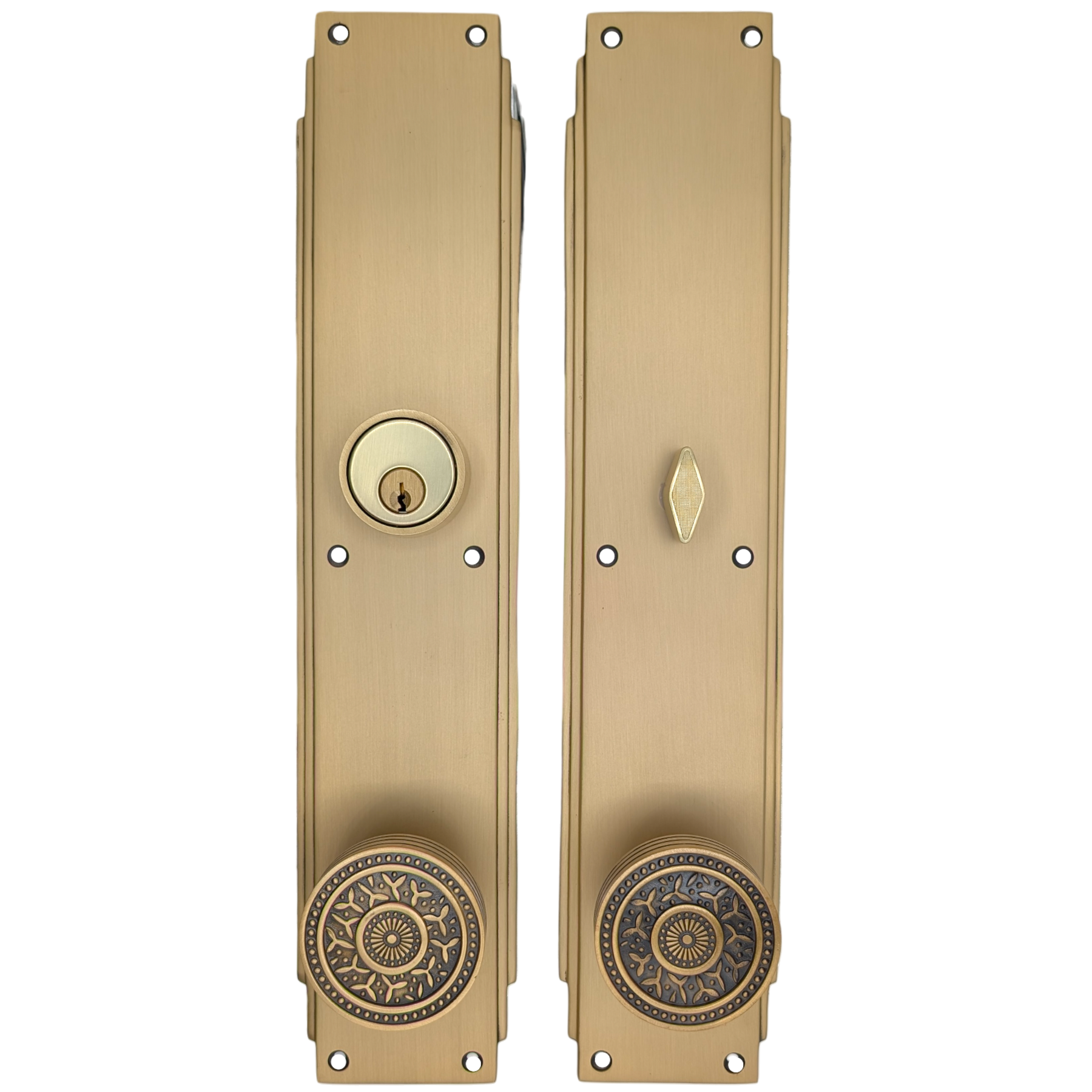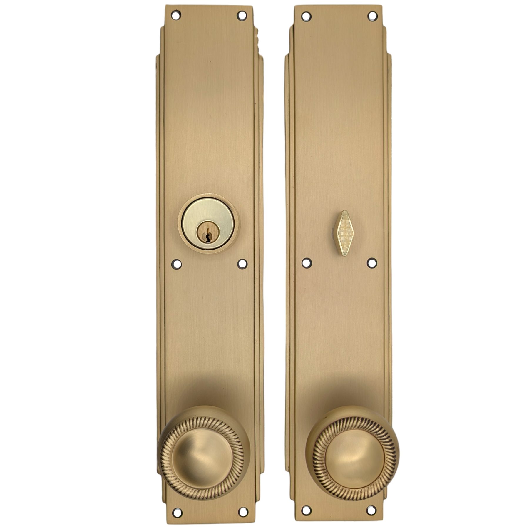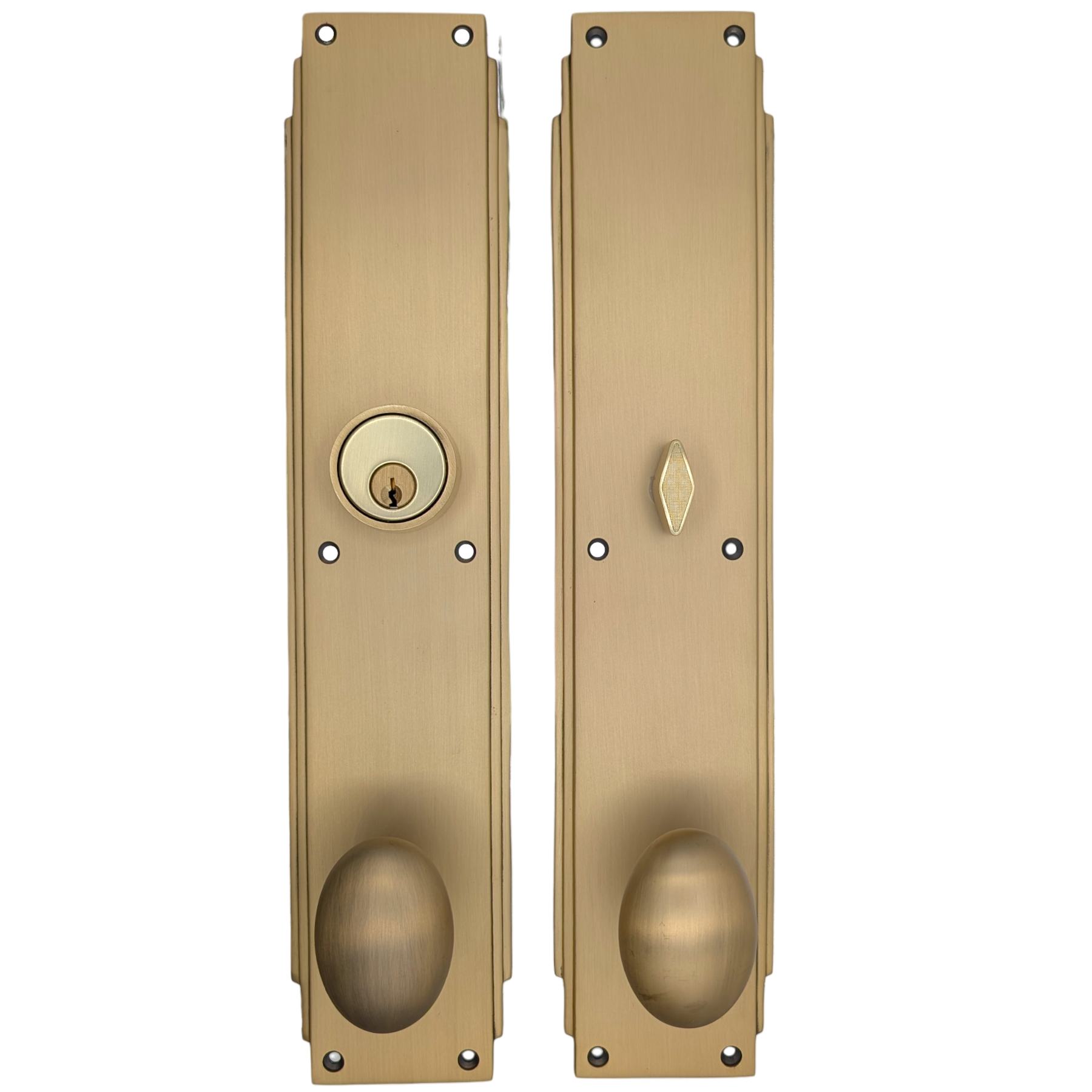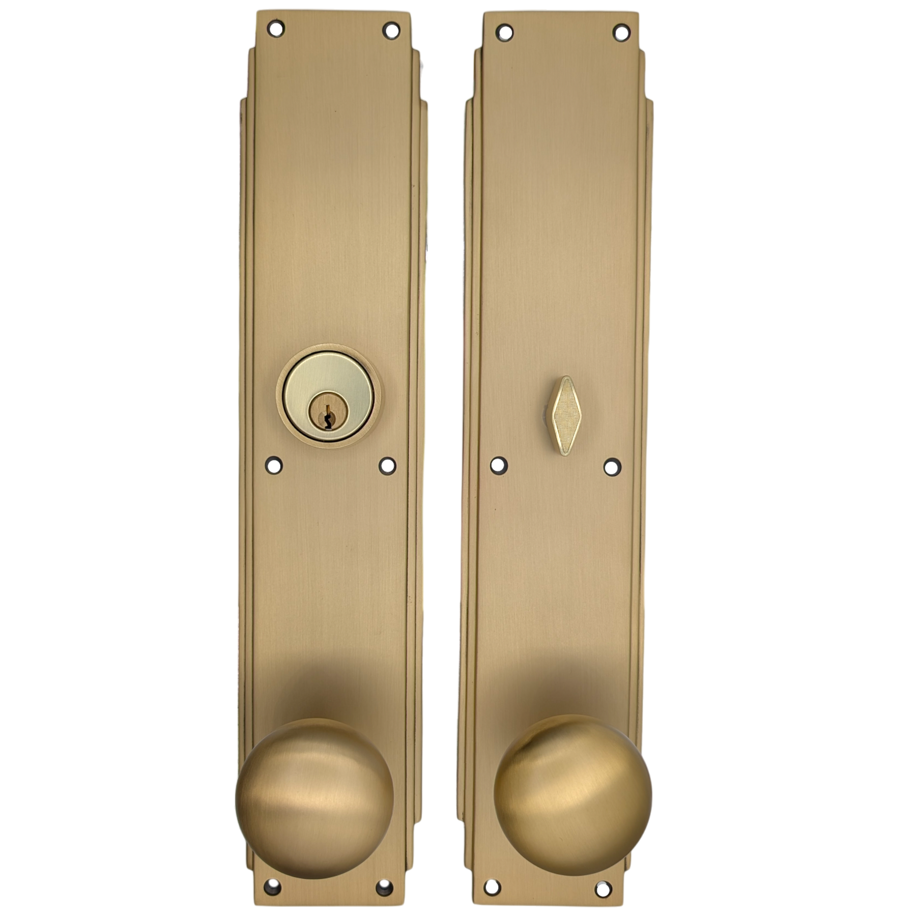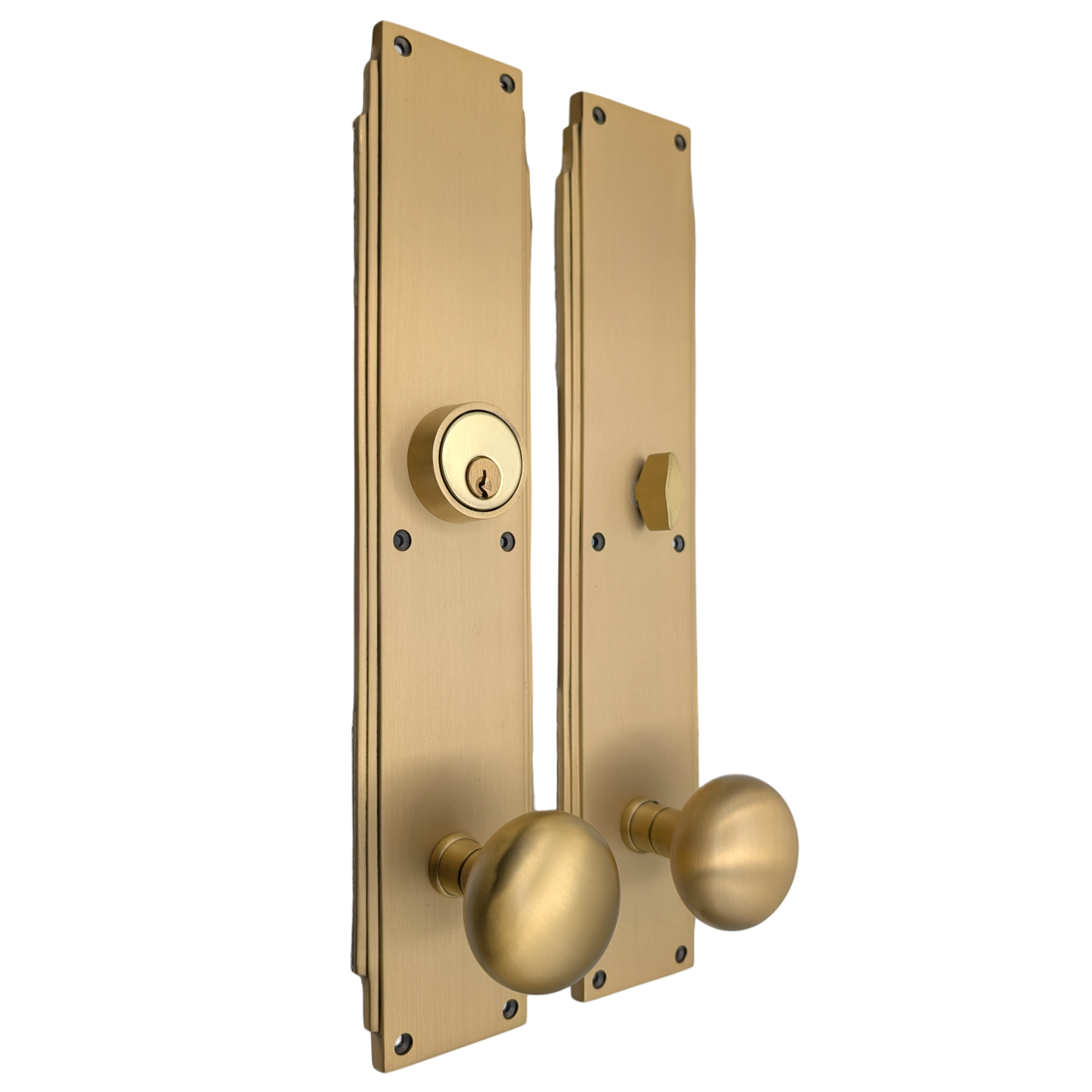 This solid brass single-door entryway set measures 3 inches wide by 14 inches tall. Choose the brass knob style that best complements your door. The standard center-to-center distance from the deadbolt to the knob is 5 1/2 inches, with other spacing options available upon request as a custom order.