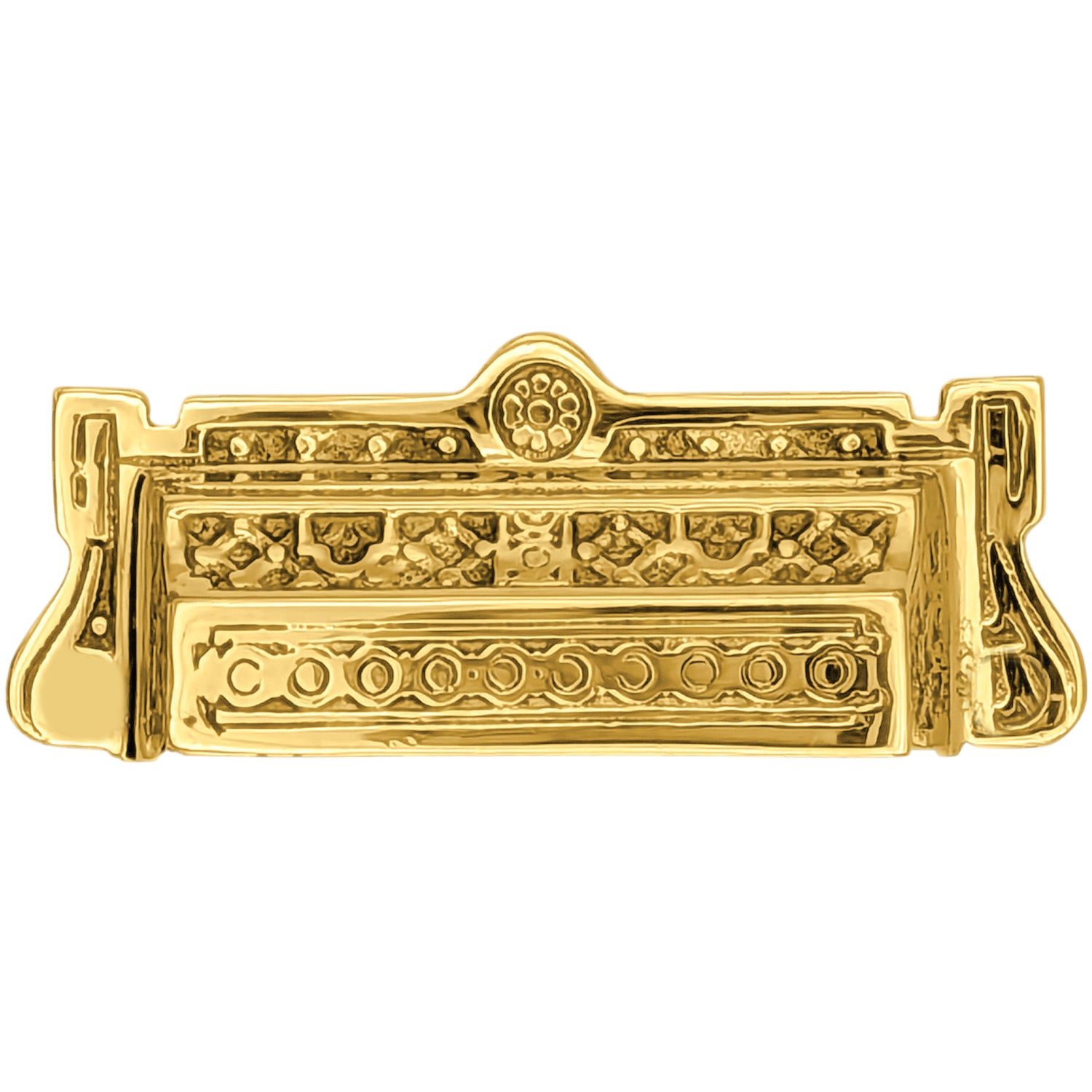 Measures 3 7/8 inches long and 1 3/4 inches tall. Center to center mounting distance is 3 3/8 inches. Highly ornate and hand finished detailing. Available in polished brass, antique brass, and black bronze. Comes complete with mounting hardware.