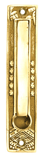 This edge pull measures 5 inch tall and 1 inch wide. Mounts into the side of the door with two wood screws. Comes complete with mounting hardware. The broken leaf pattern was first popular during the early twentieth century in the United States and is still popular today. Comes in several finishes including Polished Brass, Antique Brass, and Black Bronze.