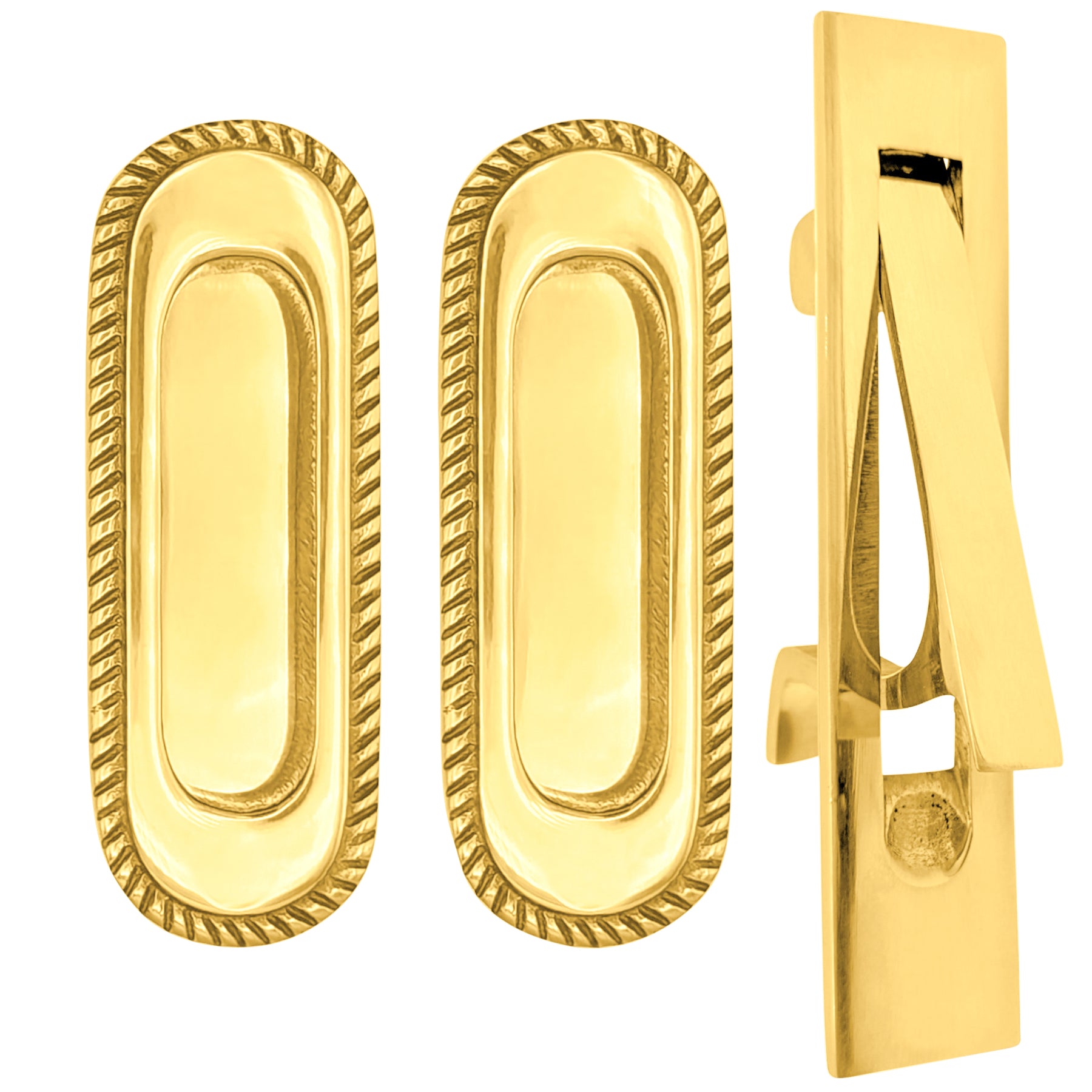 The flush pull measures approximately 4 inches tall by 1 2/5 inch wide and the edge pull measures approximately 5 inches tall by 1 inch wide. The set is crafted from solid brass, this detailed hardware piece comes complete with complementary screws, ensuring easy installation with all the necessary mounting hardware included. For a flush finish, routing may be necessary.