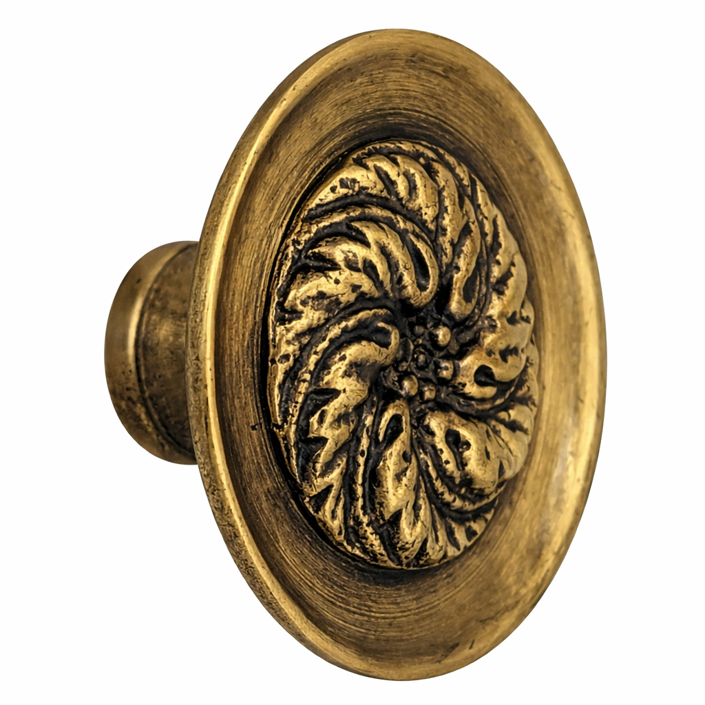 ##Antique Hardware## 1 4/5 Inch Solid Brass Round Floral Print Leaf Cabinet & Furniture Knob