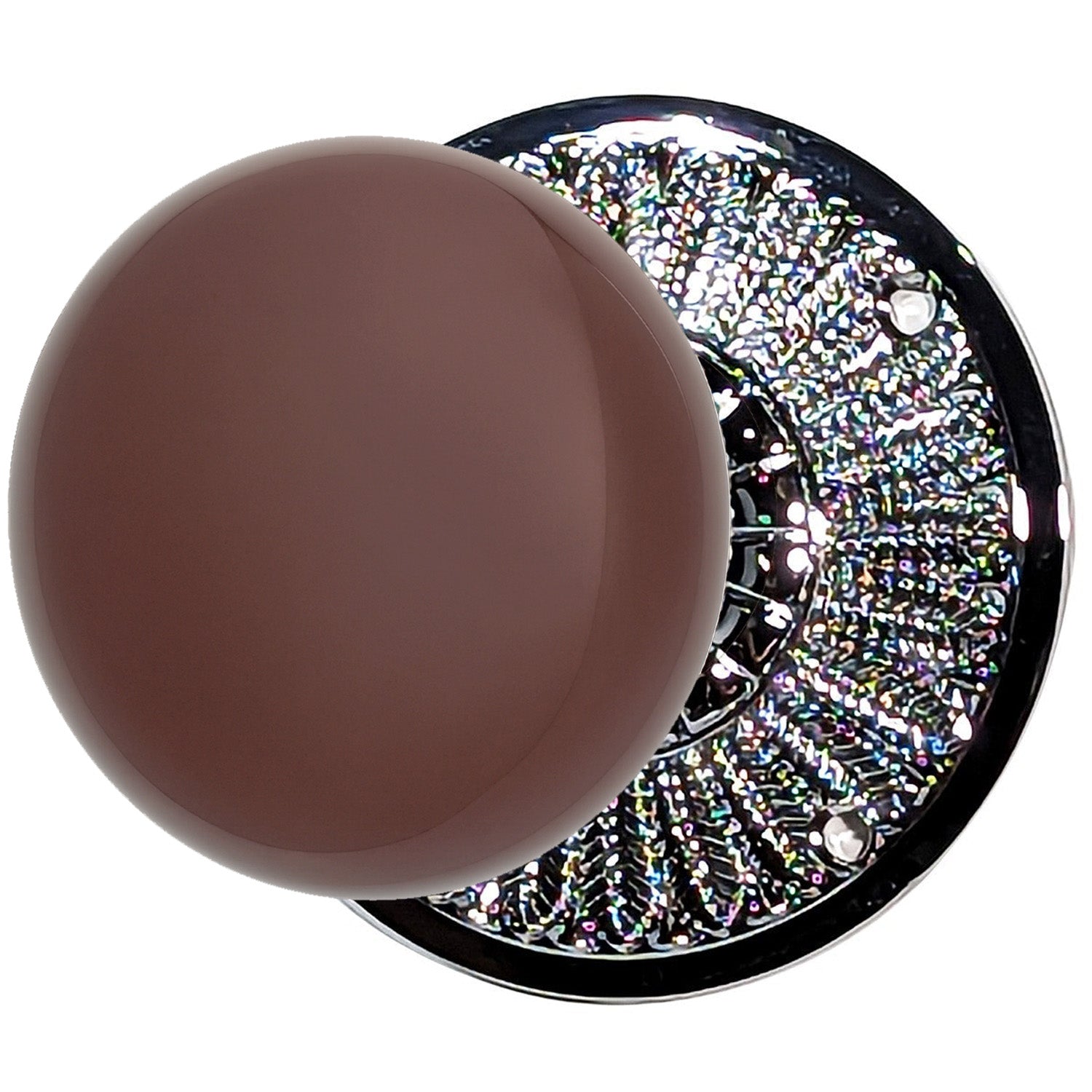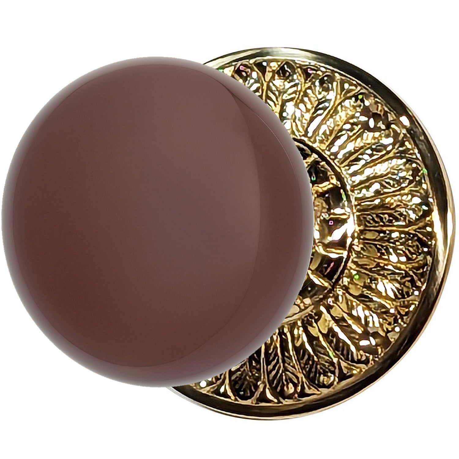 Brown Porcelain Door Knob with Brass Feathers Rosette - The genuine brown porcelain and measures 2 3/8 inches in diameter (approximate) and has a projection of 2 1/4 inches. Solid brass rosette plates screws directly into the door with three wood screws and measures 3 1/8 inches in diameter.